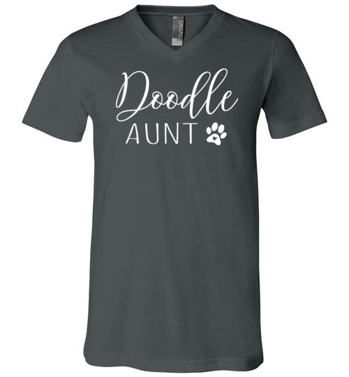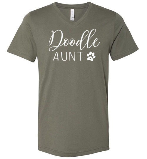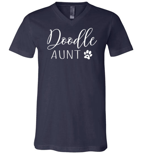 Doodle Aunt v-neck tee with paw print and a heart for women who love their brother or sister's goldendoodle, labradoodle, ausidoodle, bernadoodle or other doodle dog. A cute Christmas gift, Mothers Day present, Valentine's gift or birthday gift for your sister who loves your doodle as much as you do.