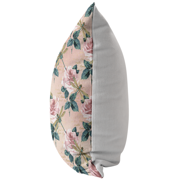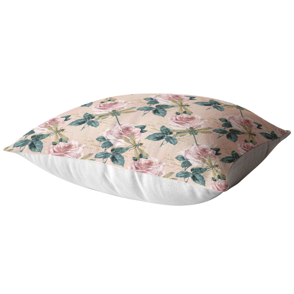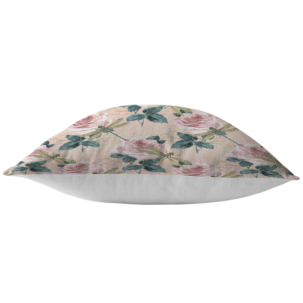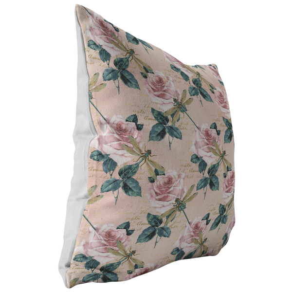 Dragonflies and pink roses on a vintage background pillow or pillow cover. A great addition to any Easter or spring home decor.