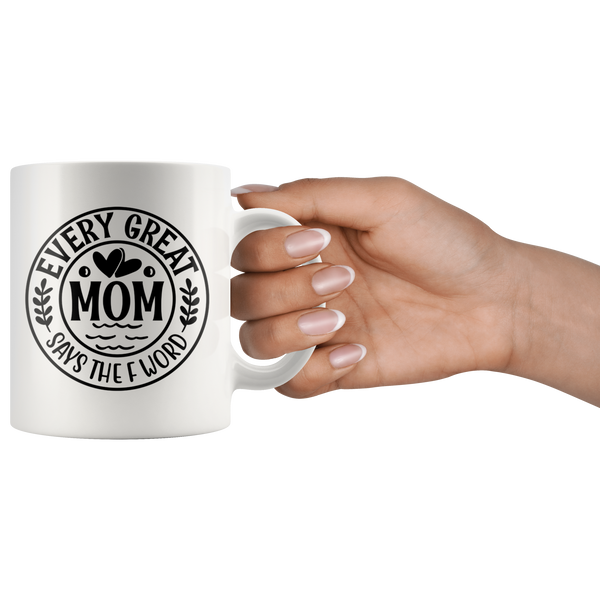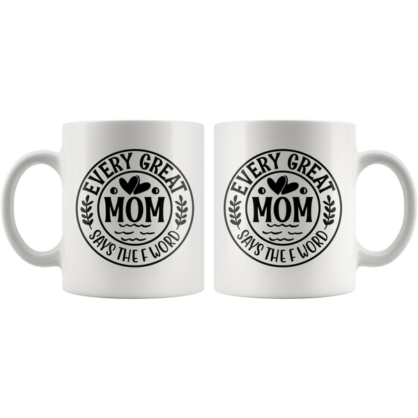 Every Great Mom Says the F Word mug for women. Makes a funny Mother's Day gift, birthday present or Christmas gift for mom.