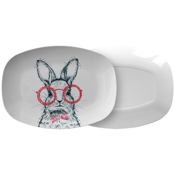 10x14 hipster bunny wearing red glasses and a bow tie serving platter. Available individually or in a set of 2 or 4. Manufactured from revolutionary ThermoSāf® Polymer that is: