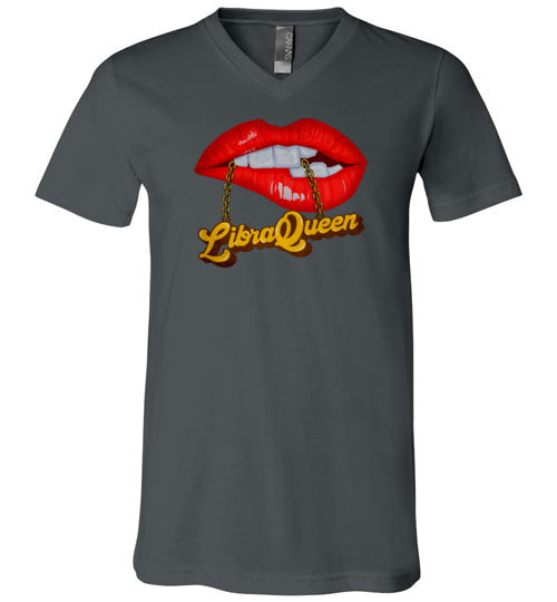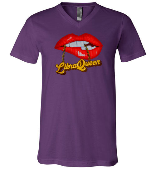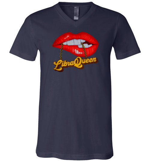 Libra Queen lips and chain v-neck tee for women. A fun astrology and hororscope Christmas gift or birthday gift idea for women born in September or October.