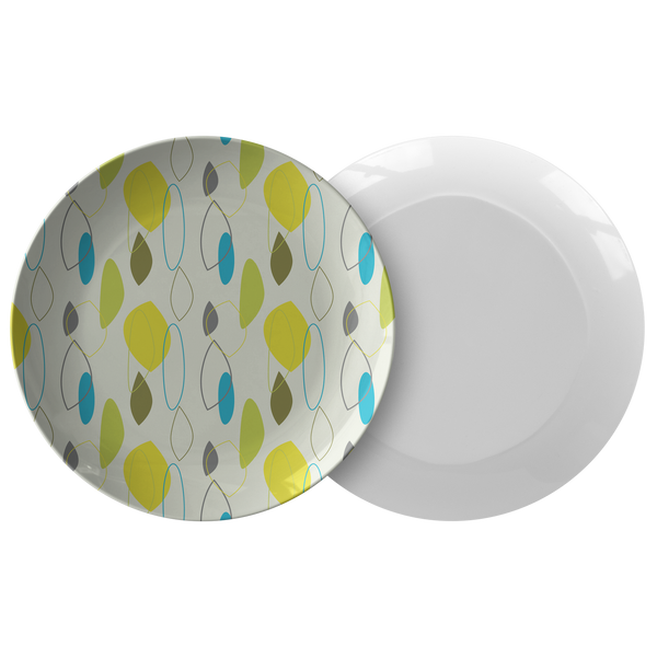 Mid century modern 10" dinner plates featuring a green, gray, yellow and blue geometric pattern. Available individually or in a set of 2 or 4. These make great everyday dishes and also look great hanging on the wall as art. Manufactured from revolutionary ThermoSāf® Polymer that is: