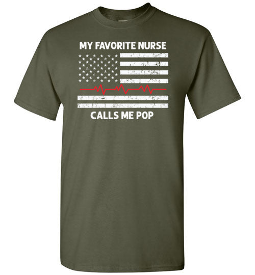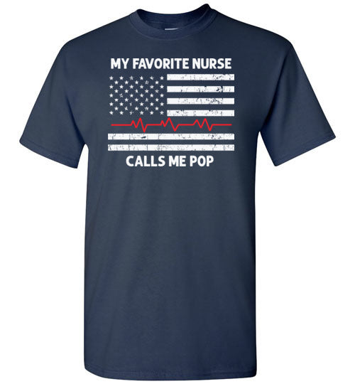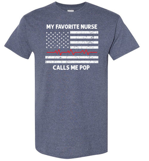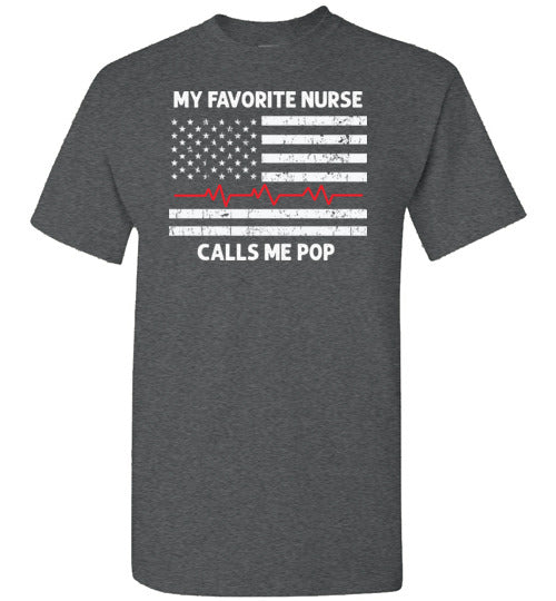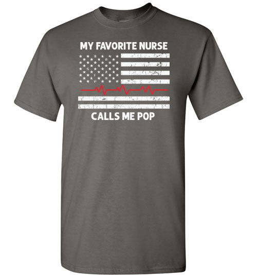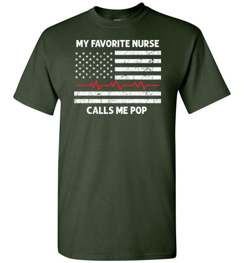 My Favorite Nurse Calls Me Pop crewneck t-shirt for men. Makes a great Father's Day or birthday gift for the proud father or grandfather of a nurse.
