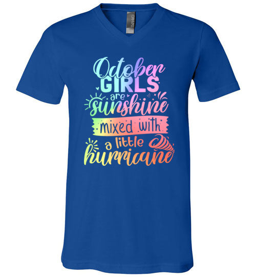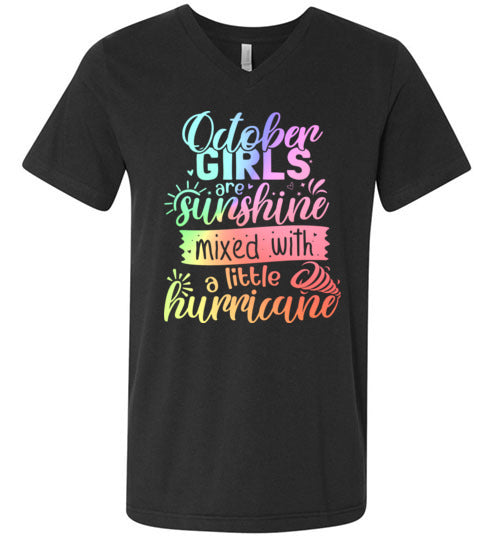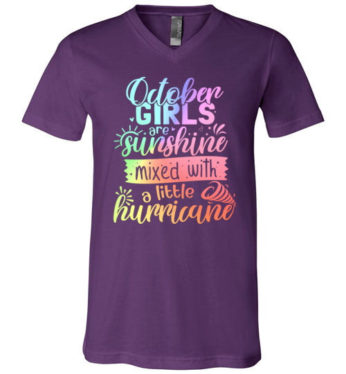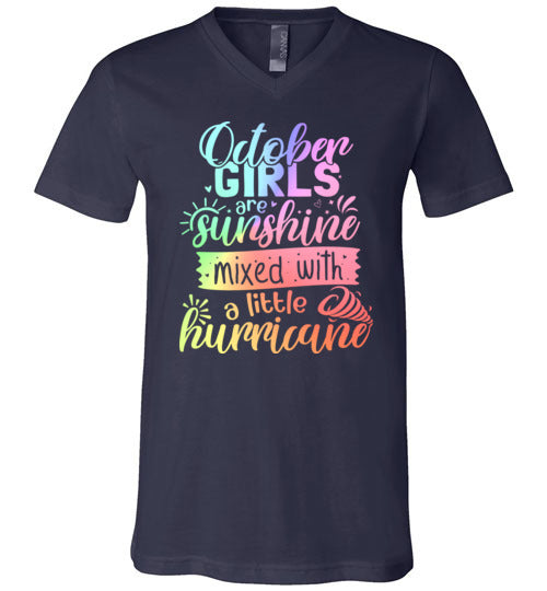October Girls are Sunshine Mixed with a Little Hurricane zodiac v-neck tee for women. A fun astrology and hororscope Christmas gift or birthday gift idea for women born in September or October.