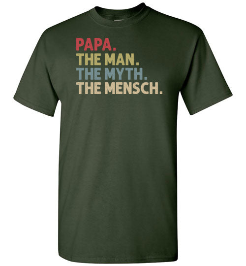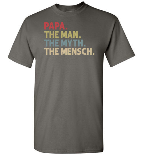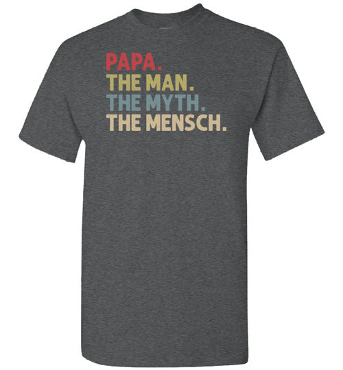 Papa The Man The Myth the Mensch funny crewneck t-shirt for men. Makes a great birthday gift idea, Father's Day gift or Hanukkah gift for any Jewish dad or grandpa you call Papa.