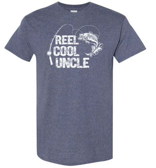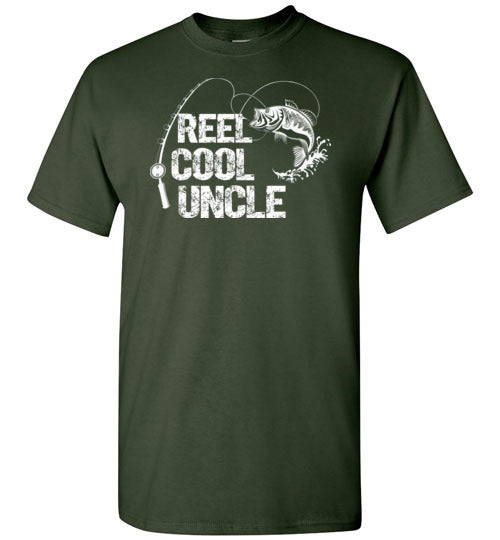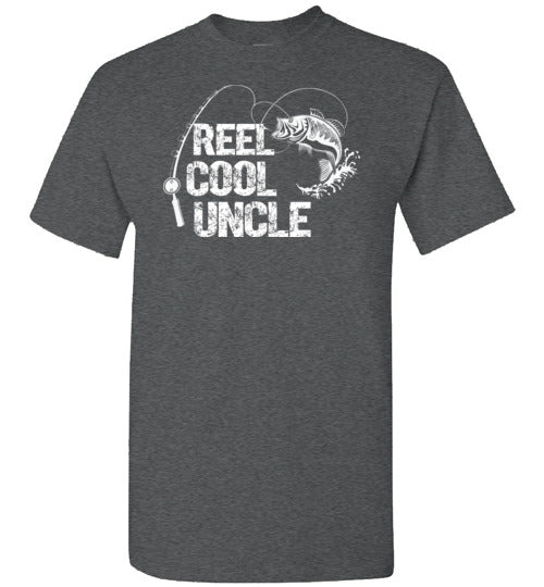 Reel Cool Uncle crewneck t-shirt for men. Makes a great Christmas gift, Father's Day or birthday gift idea from niece or nephew for any uncle who loves to fish.