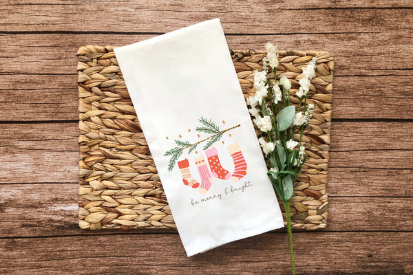 Be Merry and Bright 27x27 flour sack hand towel featuring red and pink Christmas stockings hanging on a Christmas tree branch. This holiday kitchen dish towel or bathroom hand towel makes the perfect addition to any festive home for the winter season or as a fun present for any Xmas loving man or woman - mom, dad, grandma, grandpa, husband, wife or friend.