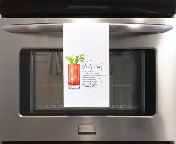 Bloody Mary Recipe 100% cotton flour sack kitchen towel. 28x28 inches.This cute hand towel makes the perfect birthday, Christmas, Thanksgiving, hostess, housewarming or Mother's Day gift idea for women and men. What's so special about flour sack towels and why are they so popular? Flour sack towels are made from tightly woven cotton which creates a strong and durable material. They got their name because they were originally made from the same type of cotton sacks that were used to store flour. They are known for their high absorbency and softness, making them perfect for many different uses in the kitchen and home such as drying dishes, wiping up spills and covering dough while it rises. They can also be used as a makeshift cheesecloth to strain liquids and they make an interesting decorative addition to your kitchen or in the bathroom as a cute hand towel for guests.• 100% Cotton