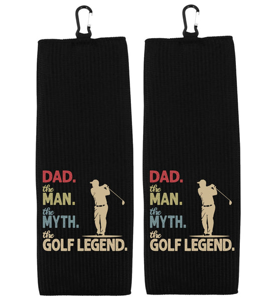 Dad the Man the Myth the Golf Legend 100% Microfiber Waffle Weave Golf Towel is more than just a towel – it's a heartfelt tribute to the best Dad out on the green! Hand printed with love in our California workshop using an eco-friendly and non-toxic dye process, this towel is the ideal accessory for any father who enjoy spending time on the golf course. Made from premium quality microfiber, this golf towel offers superior absorbency and durability. It's soft to the touch, ensuring a gentle yet effective cleaning experience for golf clubs, balls, and hands. It is generously sized to provide ample coverage, measuring 17 x 17 inches. It features a strong yet lightweight construction, making it easy to carry around the course without weighing down Dad's golf bag. The silver carabiner clip allows for convenient storage and quick access when needed. This towel will not only keep Dad's golf gear clean and dry but will also serves as a constant reminder of the love and appreciation his family holds for him. It's a thoughtful and practical gift that will undoubtedly bring a smile to his face every time he steps onto the fairway.• 17" x 17"