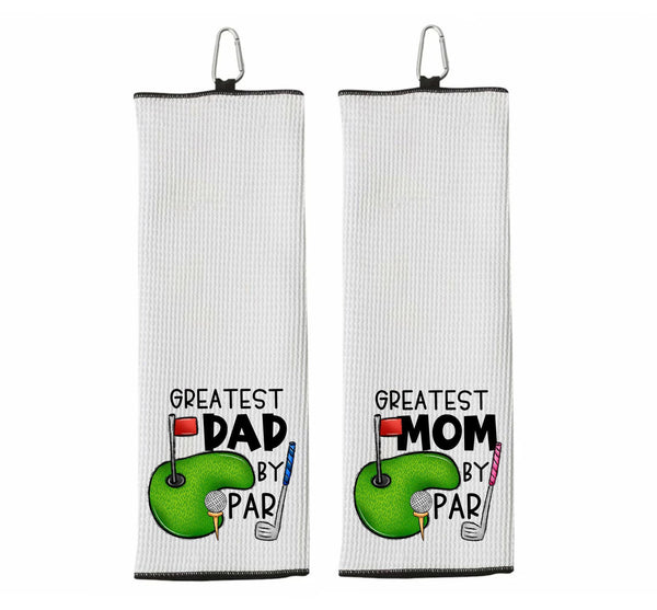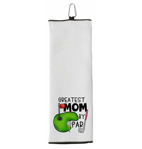 Greatest Mom by Par 100% Microfiber Waffle Weave Golf Towel is hand printed with love in our California workshop using an eco-friendly and non-toxic dye process. This towel is the ideal accessory for women who enjoy spending time on the golf course. Made from premium quality microfiber, this golf towel offers superior absorbency and durability. It's soft to the touch, ensuring a gentle yet effective cleaning experience for golf clubs, balls, and hands. It is generously sized to provide ample coverage, measuring 17 x 17 inches. It features a strong yet lightweight construction, making it easy to carry around the course without weighing down your golf bag. The silver carabiner clip allows for convenient storage and quick access when needed. • 17" x 17"