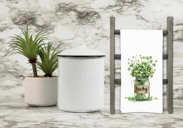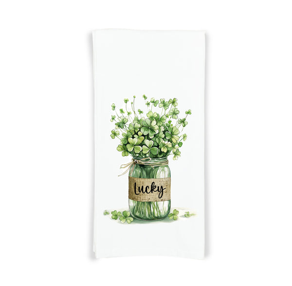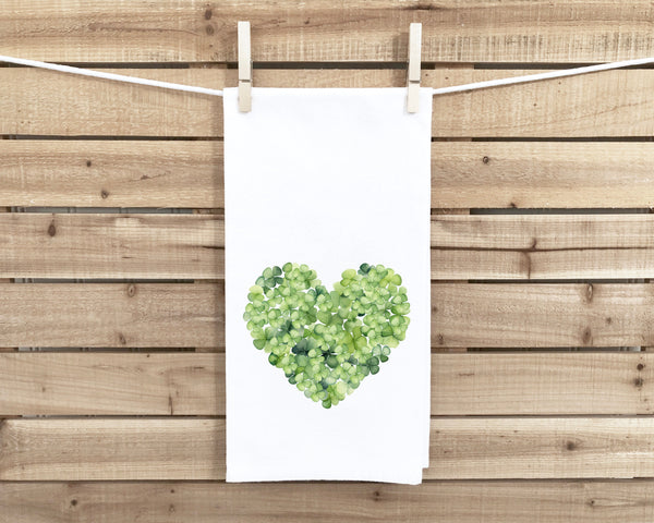 Lucky Shamrock Bouquet and Shamrock Heart set of two 27x27 flour sack kitchen towels.Use them for St. Patty's Day party decor, baking, cooking, crafting, dusting, wiping up spills, straining flour or water, polishing surfaces, as a decorative addition to your kitchen or bath or as a dish cloth.• 100% Cotton