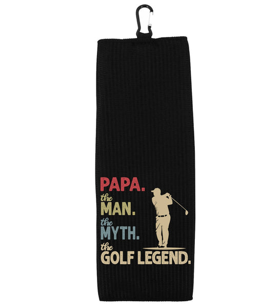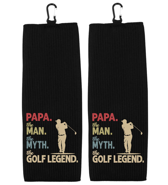 Papa the Man the Myth the Golf Legend 100% Microfiber Waffle Weave Golf Towel is more than just a towel – it's a heartfelt tribute to the best Papa out on the green! Hand printed with love in our California workshop using an eco-friendly and non-toxic dye process, this towel is the ideal accessory for grandpas or dads called Papa who enjoy spending time on the golf course. Made from premium quality microfiber, this golf towel offers superior absorbency and durability. It's soft to the touch, ensuring a gentle yet effective cleaning experience for golf clubs, balls, and hands. It is generously sized to provide ample coverage, measuring 17 x 17 inches. It features a strong yet lightweight construction, making it easy to carry around the course without weighing down Papa's golf bag. The silver carabiner clip allows for convenient storage and quick access when needed. This towel will not only keep Papa's golf gear clean and dry but will also serves as a constant reminder of the love and appreciation his family holds for him. It's a thoughtful and practical gift that will undoubtedly bring a smile to his face every time he steps onto the fairway.• 17" x 17"
