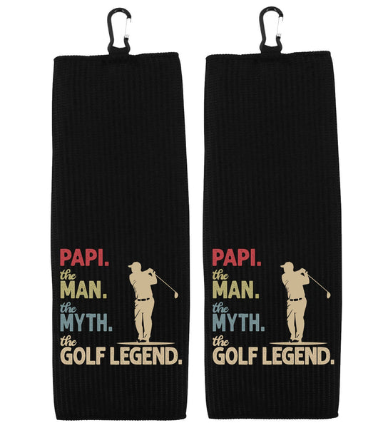 Papi the Man the Myth the Golf Legend 100% Microfiber Waffle Weave Golf Towel is more than just a towel – it's a heartfelt tribute to the best Papi out on the green! Hand printed with love in our California workshop using an eco-friendly and non-toxic dye process, this towel is the ideal accessory for grandpas called Papi who enjoy spending time on the golf course. Made from premium quality microfiber, this golf towel offers superior absorbency and durability. It's soft to the touch, ensuring a gentle yet effective cleaning experience for golf clubs, balls, and hands. It is generously sized to provide ample coverage, measuring 17 x 17 inches. It features a strong yet lightweight construction, making it easy to carry around the course without weighing down Papi's golf bag. The silver carabiner clip allows for convenient storage and quick access when needed. This towel will not only keep Papi's golf gear clean and dry but will also serves as a constant reminder of the love and appreciation his family holds for him. It's a thoughtful and practical gift that will undoubtedly bring a smile to his face every time he steps onto the fairway.• 17" x 17"