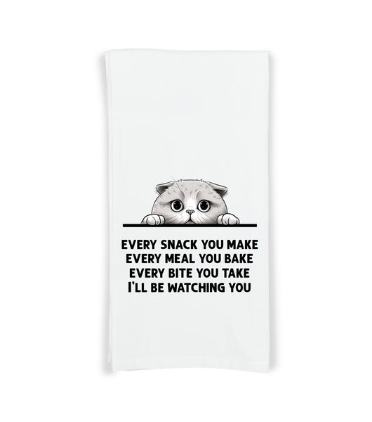 Every Snack You Make Every Meal You Bake Every Bite You Take I'll Be Watching You 27x27 Scottish Fold cat flour sack kitchen towel.This cute, funny hand towel makes the perfect birthday, Christmas, housewarming, Mother's Day or Father's Day gift idea for cat loving men and women. Use it for baking, cooking, crafting, dusting, wiping up spills, straining flour or water, polishing surfaces, as a decorative addition to your kitchen or bath or as a dish cloth.• 100% Cotton