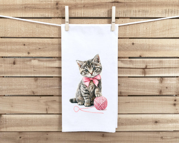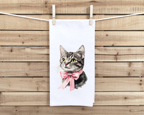 Set of 2 Gray Tabby Cat Flour Sack Kitchen Towels Cute Pink Bow Coquette Girly Kitten Tea Towel Housewarming Hostess Birthday Christmas Gift