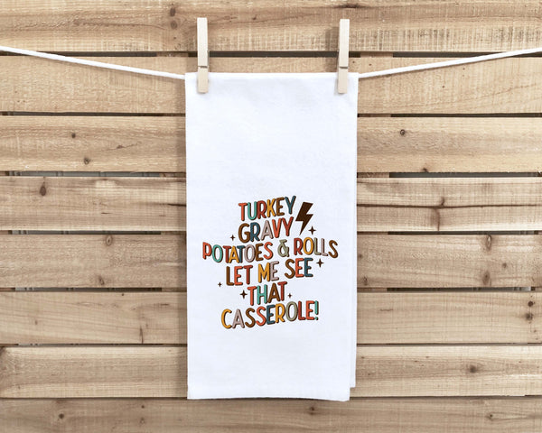 Set of three colorful and fun Thanksgiving kitchen towels - Gobble Gobble Gobble Til You Wobble, Pies Before Guys and Turkey Gravy Potatoes & Rolls Let Me See That Casserole. Printed with ink transfer on large 27x27 flour sack tea towels with a loop for hanging.