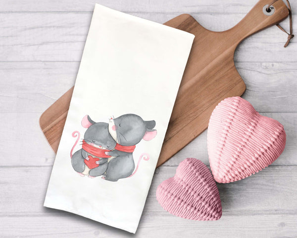 Set of four 27x27 mouse flour sack kitchen towels featuring a cute hearts and balloons theme. They make the perfect Valentine's Day kitchen or bathroom decor or any mouse lover home decor any time of year. A cute birthday, housewarming, Mother's Day or Valentines Day gift idea for mouse loving men and women. Use them for baking, cooking, crafting, dusting, wiping up spills, straining flour or water, polishing surfaces, as a decorative addition to your kitchen or bath or as a dish cloth.• 100% Cotton