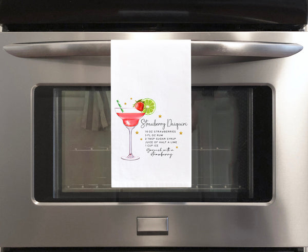 Strawberry Daiquiri Recipe Hand Towel with Hanging Loop - 100% Cotton Flour Sack Tea Towels - Home Bar Hostess Birthday Mother's Day Gift