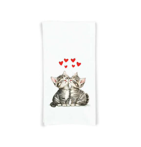 Add some kitty love to your kitchen with this adorable pair of loved up gray tabby cats sharing a sweet moment. This sweet flour sack hand towel makes the perfect birthday, Christmas, housewarming, Mother's Day or Valentine's Day gift idea for cat lovers.Use it for baking, cooking, crafting, dusting, wiping up spills, straining flour or water, polishing surfaces, as a decorative addition to your kitchen or bath or as a dish cloth.What's so special about flour sack towels and why are they so popular? Flour sack towels are made from tightly woven cotton which creates a strong and durable material. They got their name because they were originally made from the same type of cotton sacks that were used to store flour. They are known for their high absorbency and softness, making them perfect for many different uses in the kitchen and home such as drying dishes, wiping up spills and covering dough while it rises. They can also be used as a makeshift cheesecloth to strain liquids and they make an interesting decorative addition to your kitchen or in the bathroom as a cute hand towel for guests.• 100% Cotton