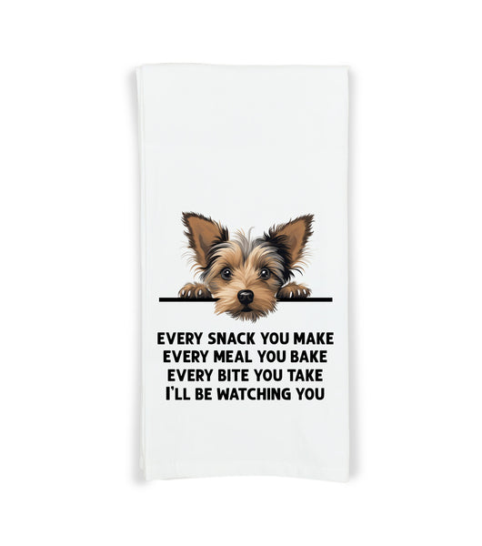 Every Snack You Make Every Meal You Bake Every Bite You Take I'll Be Watching You 27x27 Yorkshire Terrier flour sack kitchen towel.