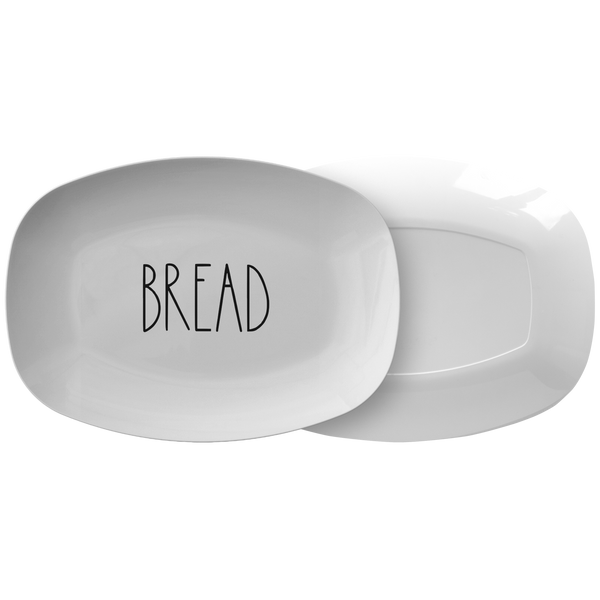 Farmhouse minimalist style platter that says BREAD. Perfect for entertaining. Makes a great Christmas, Mother's Day, Father's Day or birthday gift for men and women. 10x14" platter manufactured from revolutionary ThermoSāf® Polymer that is: