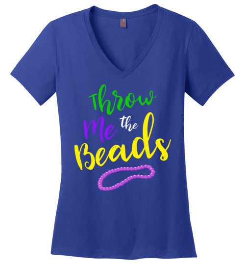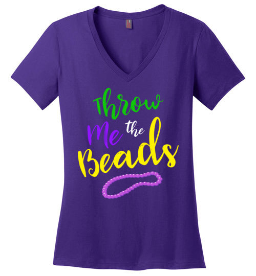 Throw Me the Beads Mardi Gras v-neck shirt featuring the traditional Mardi Gras colors of purple, green, and yellow. A cute saying on a tshirt to celebrate Fat Tuesday! This t shirt will let them know you want some beads! Great for women, teen girls, toddlers and kids spending Mardi Gras in New Orleans.