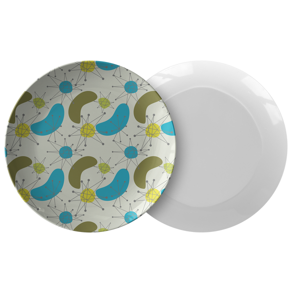 Mid century modern 10" dinner plate featuring a green, yellow and blue geometric pattern. Manufactured from revolutionary ThermoSāf® Polymer that is: