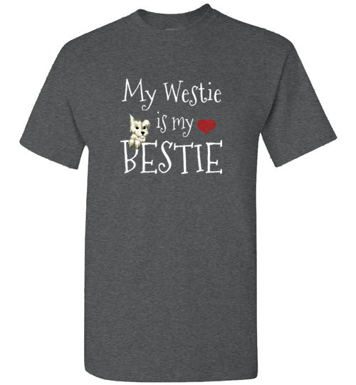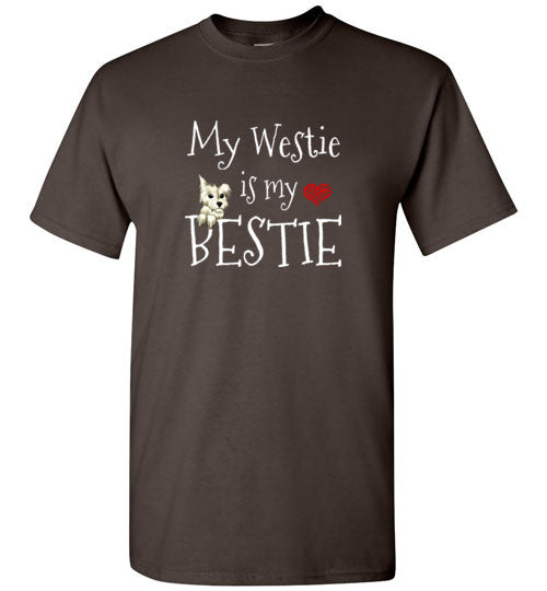My Westie Is My Bestie t shirt for men, women, teen boys and girls, and kids. If your Westie (or Westy) is your best friend then this shirt is for you! This t-shirt is the perfect Christmas, birthday, Mother's Day, or Father's Day gift for your friend, mother, mom, father, dad, sister, brother, brother, sister, aunt, uncle, grandma, grandpa, son, or daughter who loves Westies!