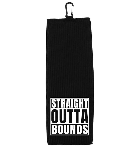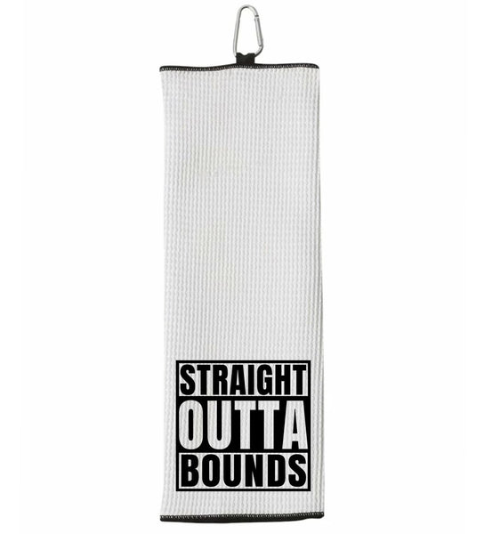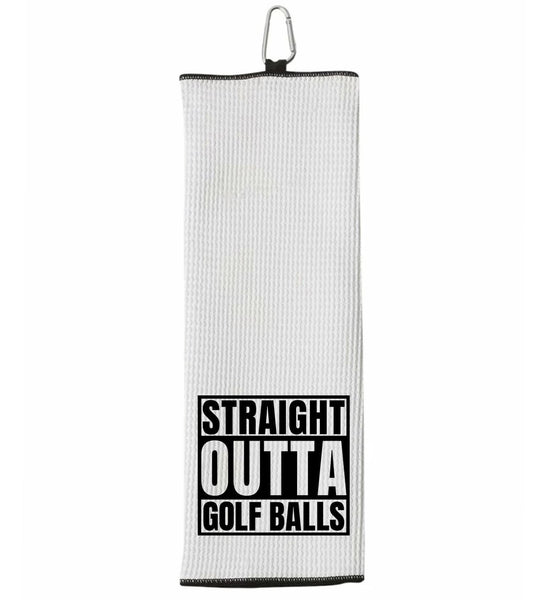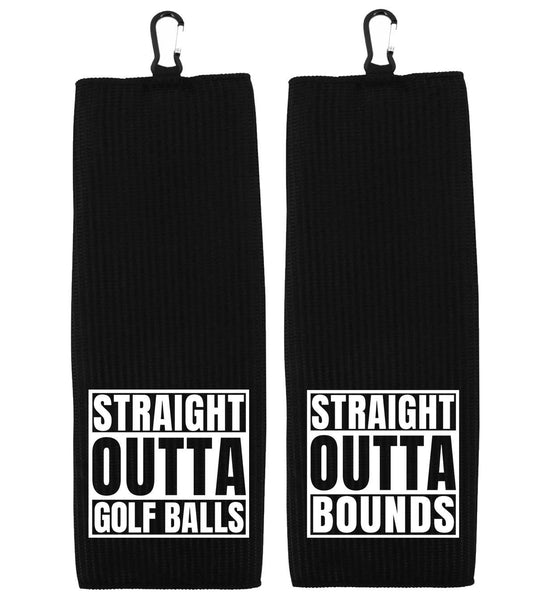 Straight Outta Golf Balls and Straight Outta Bounds Set of 2 100% Microfiber Waffle Weave Golf Towels. Hand printed with love in our California workshop using an eco-friendly and non-toxic dye process. This towel is the ideal accessory for men and women who enjoy spending time on the golf course. Made from premium quality microfiber, this golf towel offers superior absorbency and durability. It's soft to the touch, ensuring a gentle yet effective cleaning experience for golf clubs, balls, and hands. Available in two color options: black and white with black trim. Whichever color you choose, both options are guaranteed to make a stylish statement on the course. It is generously sized to provide ample coverage, measuring 17 x 17 inches. It features a strong yet lightweight construction, making it easy to carry around the course without weighing down your golf bag. The silver carabiner clip allows for convenient storage and quick access when needed. • 17" x 17"