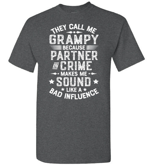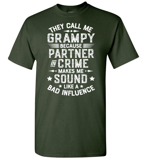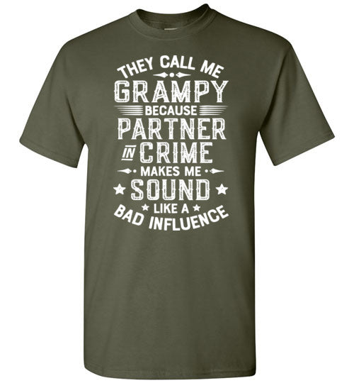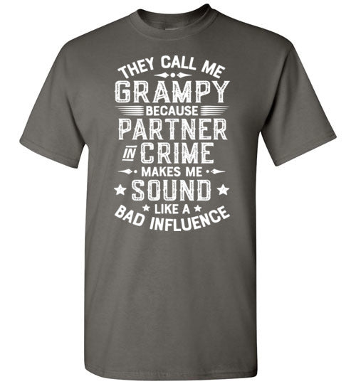 They Call Me Grampy Because Partner in Crime Makes Me Sound Like a Bad Influence shirt for men. Makes a great Christmas gift, Father's Day or birthday gift for any grandfather called Grampy.