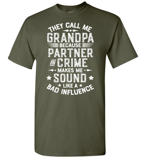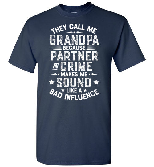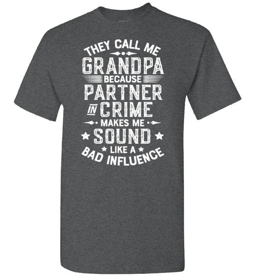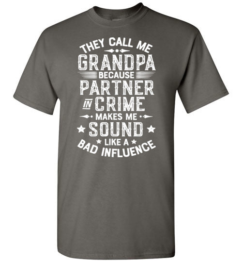 They Call Me Grandpa Because Partner in Crime Makes Me Sound Like a Bad Influence shirt for men. Makes a great Christmas gift, Father's Day or birthday gift for any grandfather.