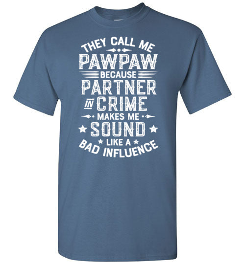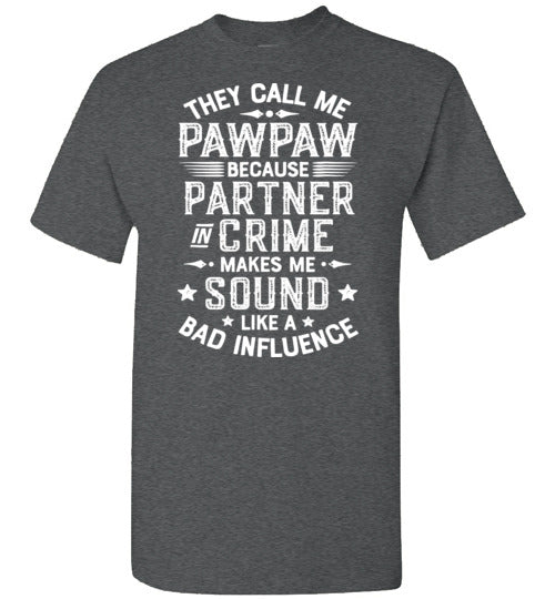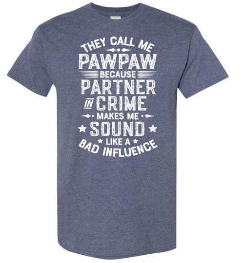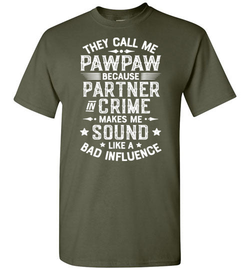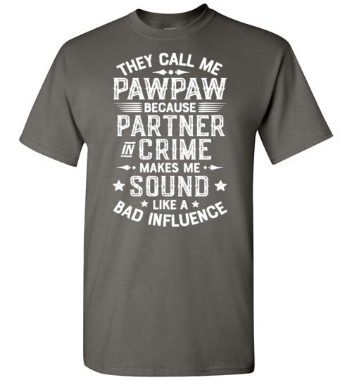 They Call Me Pawpaw Because Partner in Crime Makes Me Sound Like a Bad Influence shirt for men. Makes a great Christmas gift, Father's Day or birthday gift for any grandfather called Pawpaw.