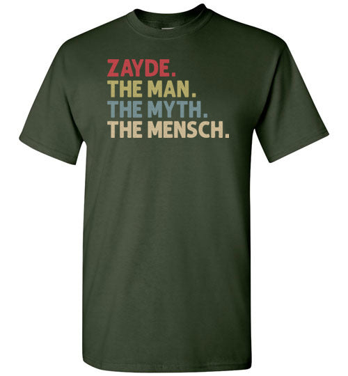 Zayde The Man The Myth the Mensch funny crewneck t-shirt for men. Makes a great birthday gift idea, Father's Day gift or Hanukkah gift for any Jewish grandpa called Zayde.